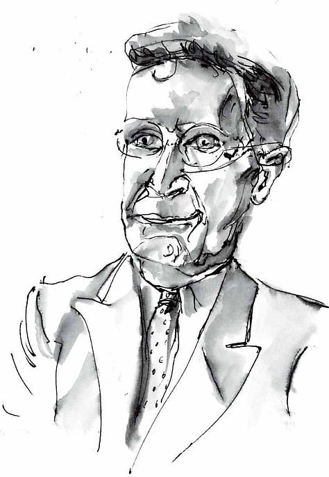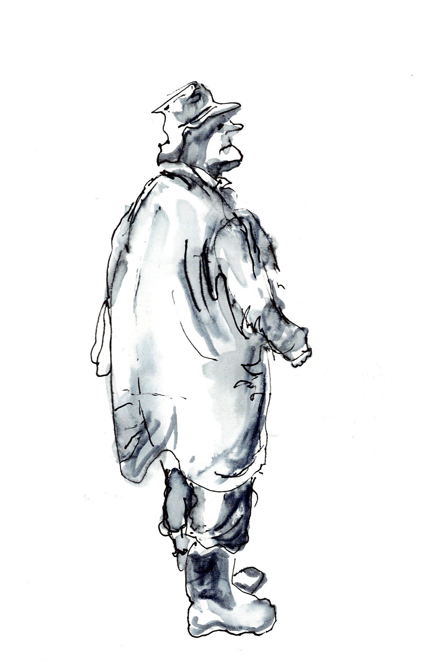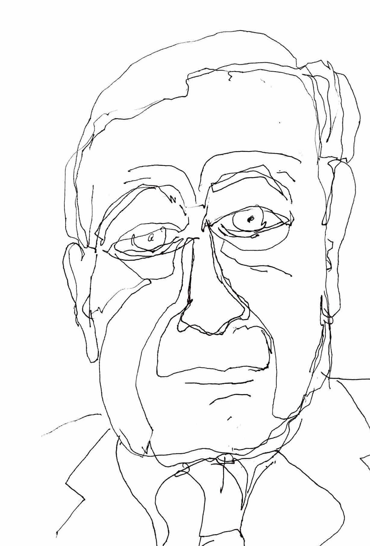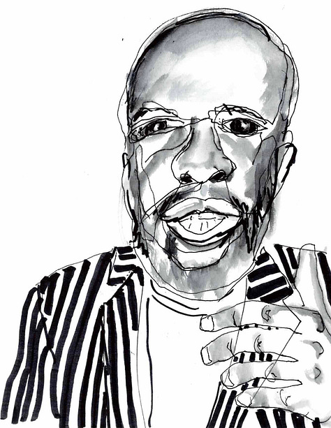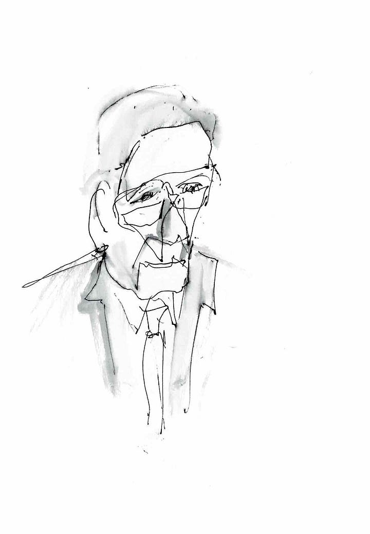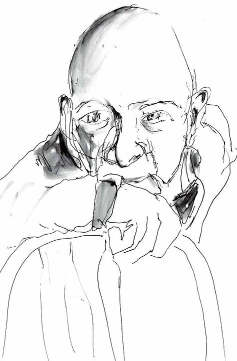 I have been painting for fifty odd years now, everything from portrait to travel, watercolor and acrylic to pastels, pen and ink and back again. In the past eight years, words took over, eclipsing music and art. But watching Bill made me miss painting! I got myself a sketchbook and started to play with faces. I use a Pentel pen and a waterbrush. That’s it. Gotta be simple or it doesn’t happen!