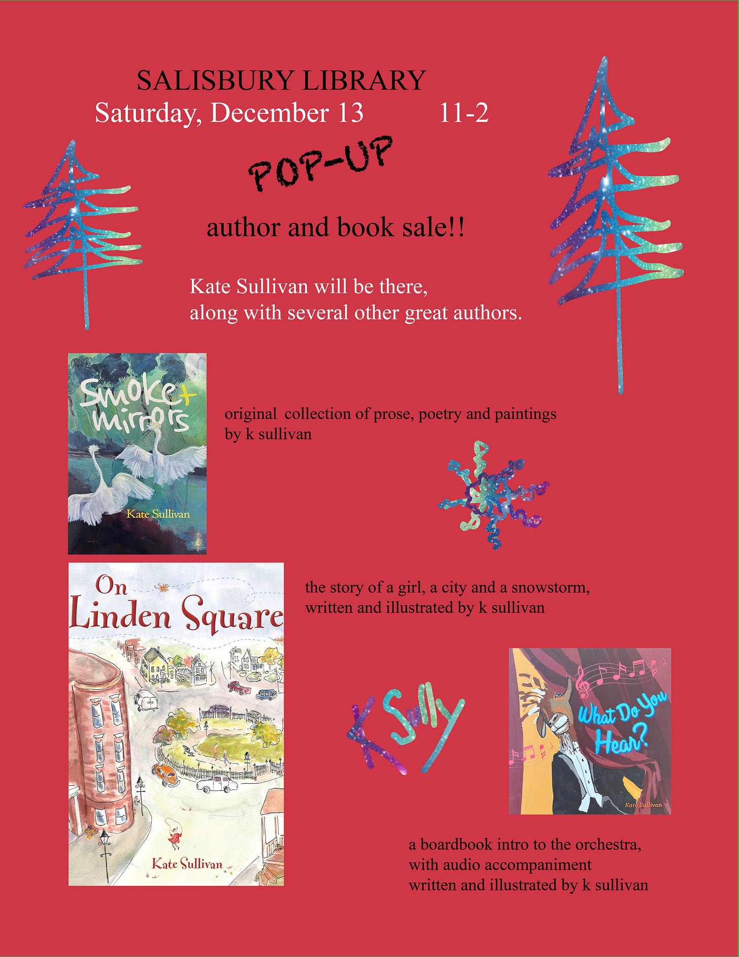 And now for the cheap commerce division. If you’re in the neighborhood, stop by The Salisbury Library on December 13 to visit with area authors. I’ll be there, with bells on, tinsel at the ready.