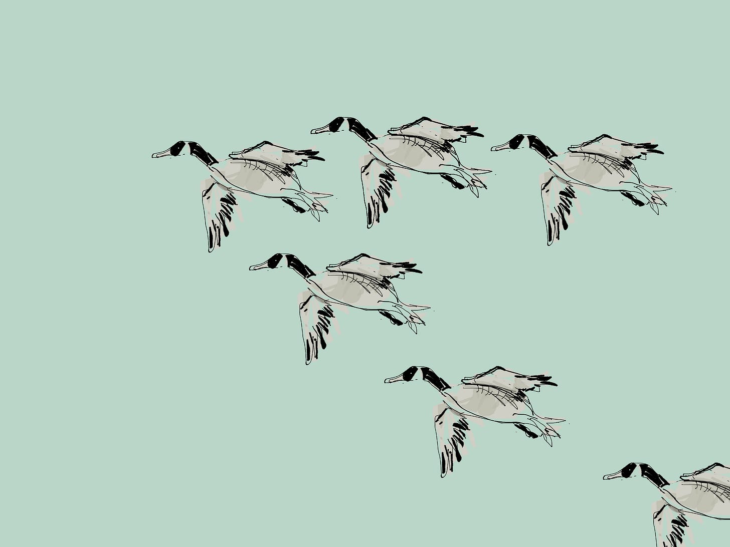as I watch from my writing desk on the second floor, the geese fly above in the vivid cold sun, the V formation, learned from birth, from northwest to southeast, trailing shadows the size of airplanes on neighborhood roofs squawking from the pond uptown to the quiet marsh grasses along the river that rushes out to sea